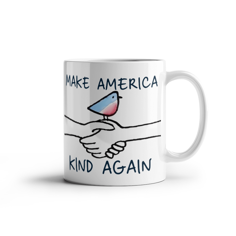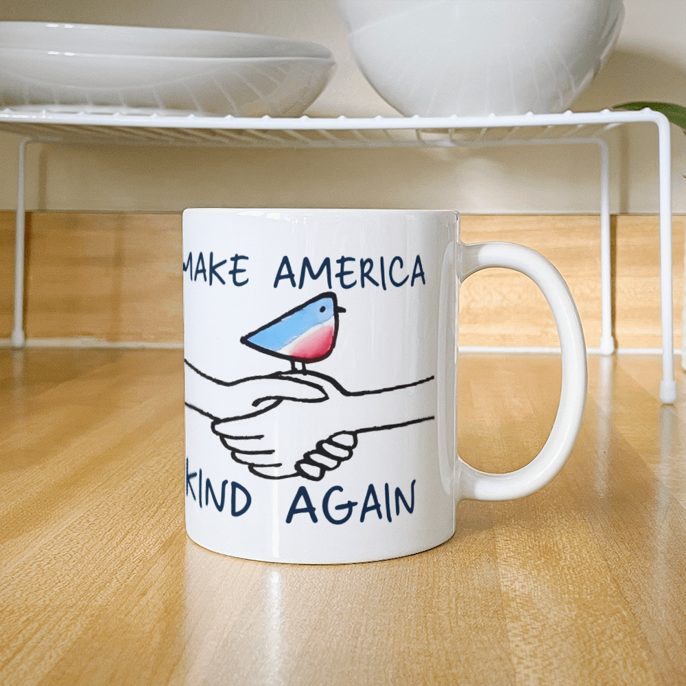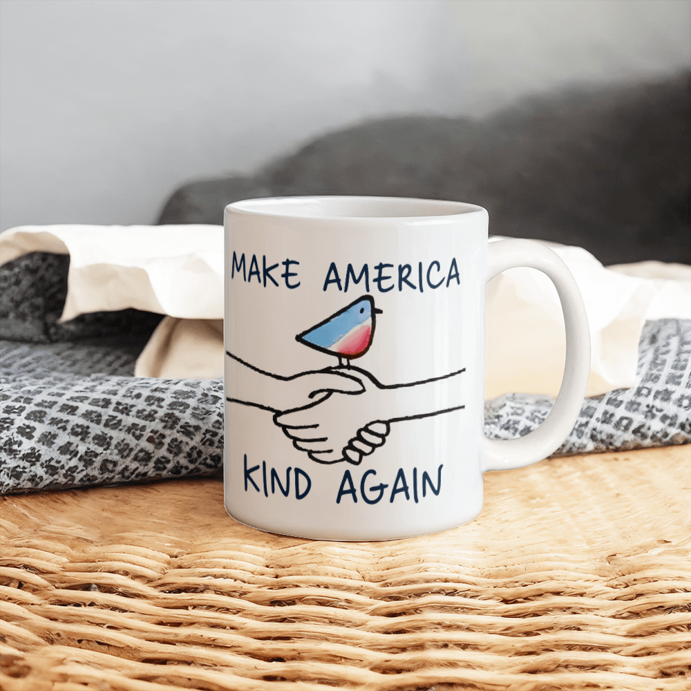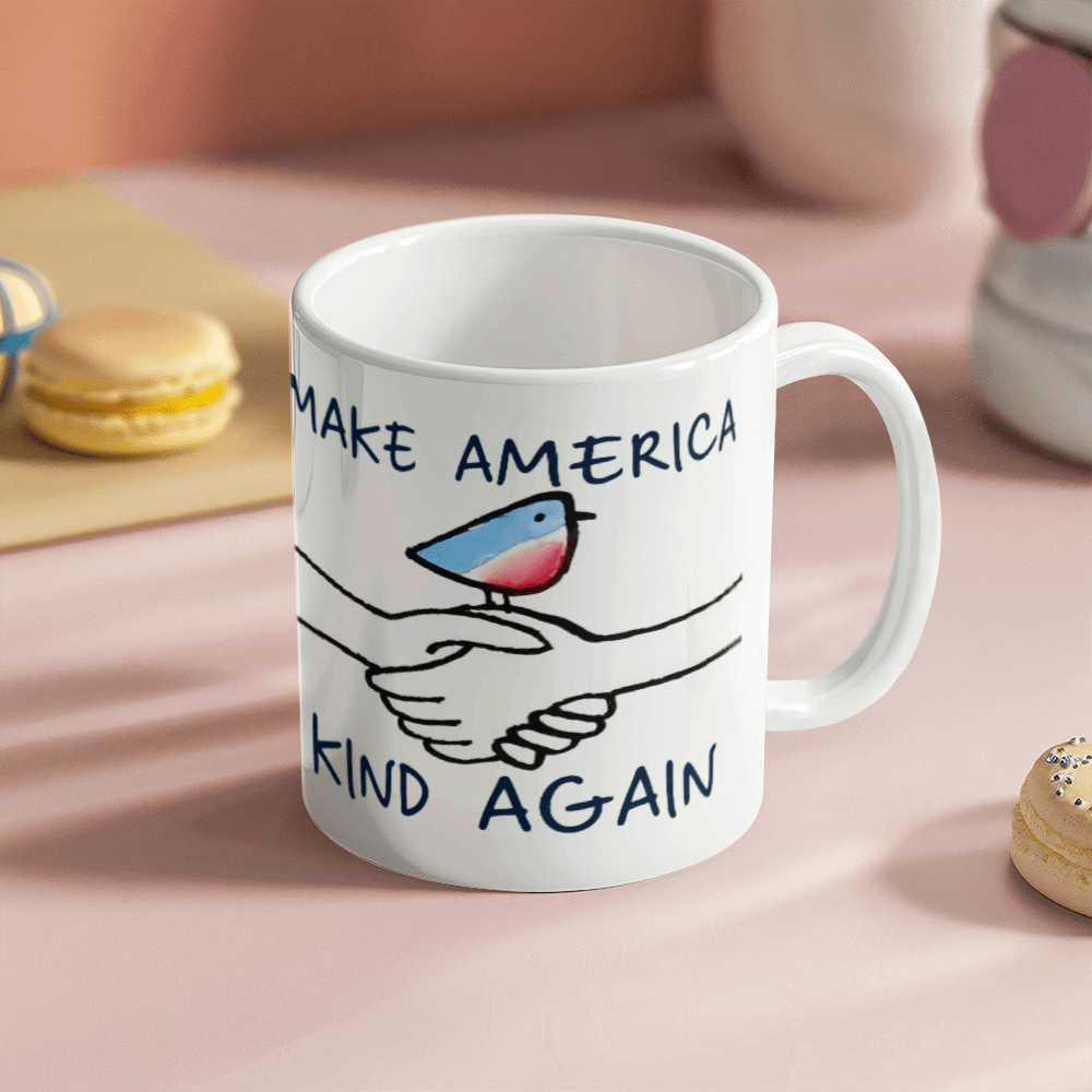 Start your day with a reminder that kindness can change the world! This beautifully crafted ceramic mug features a heartwarming design of two hands shaking, with a gentle blue and pink bird perched above — a symbol of peace and unity. The message "Make America Kind Again" invites everyone to spread kindness in their daily interactions. Whether it's for your morning coffee or a relaxing tea break, this mug is both a practical and meaningful addition to your collection.