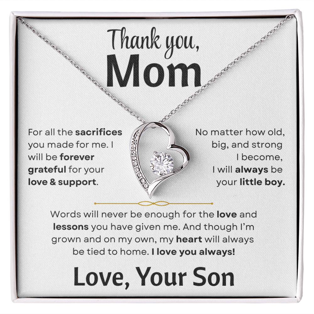 This artisan-crafted Forever Love Necklace paired with a touching message card is the perfect way for a son to say "thank you" to his mother. Whether it’s for her birthday, Mother’s Day, or just because — this gift will surely touch her heart.