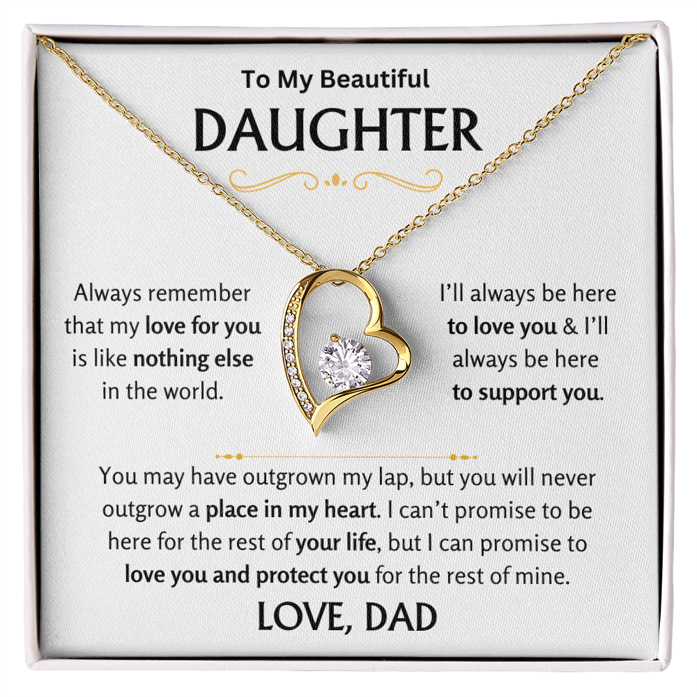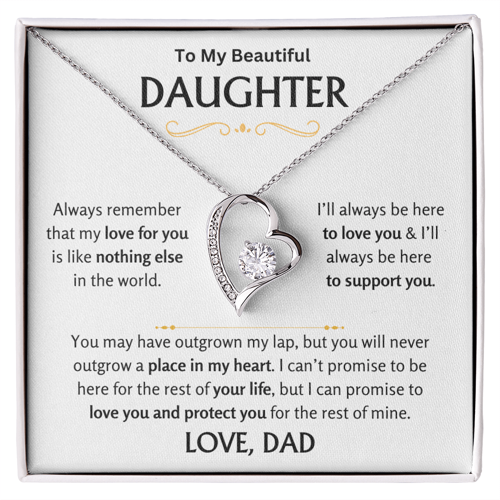This artisan-crafted Forever Love Necklace is a heartfelt way to remind your daughter of your unconditional love. Featuring a sparkling cubic zirconia stone nestled within a beautifully designed open-heart pendant, this piece symbolizes the everlasting bond between a father and his daughter.