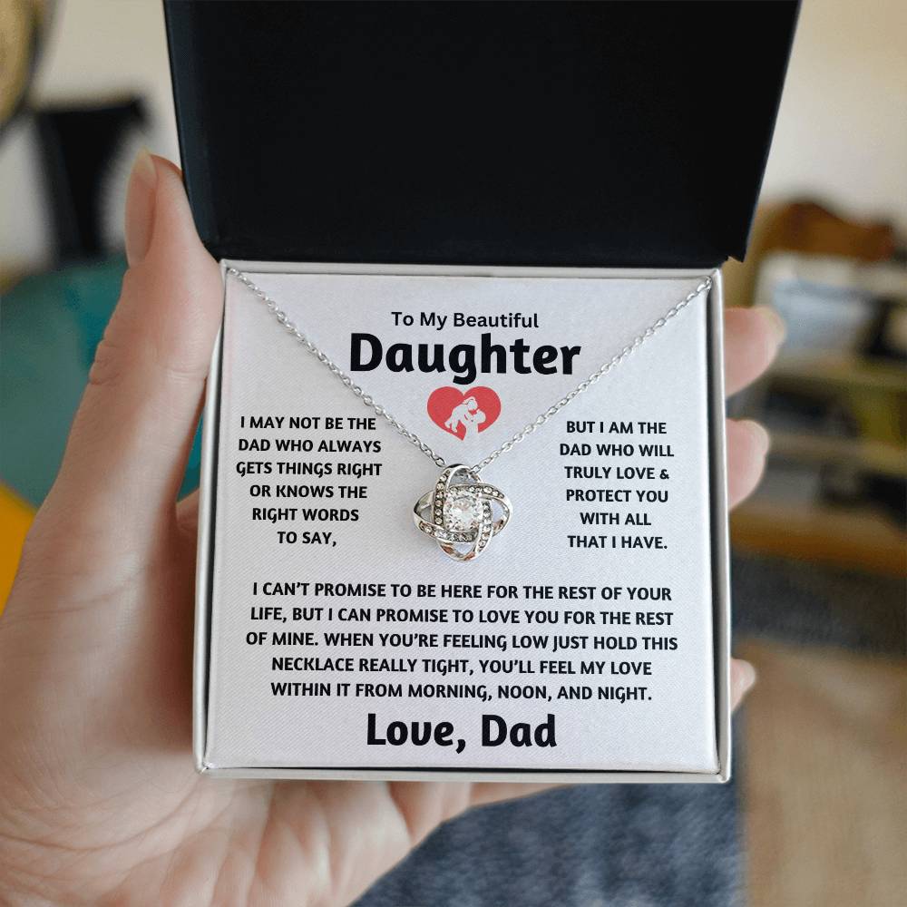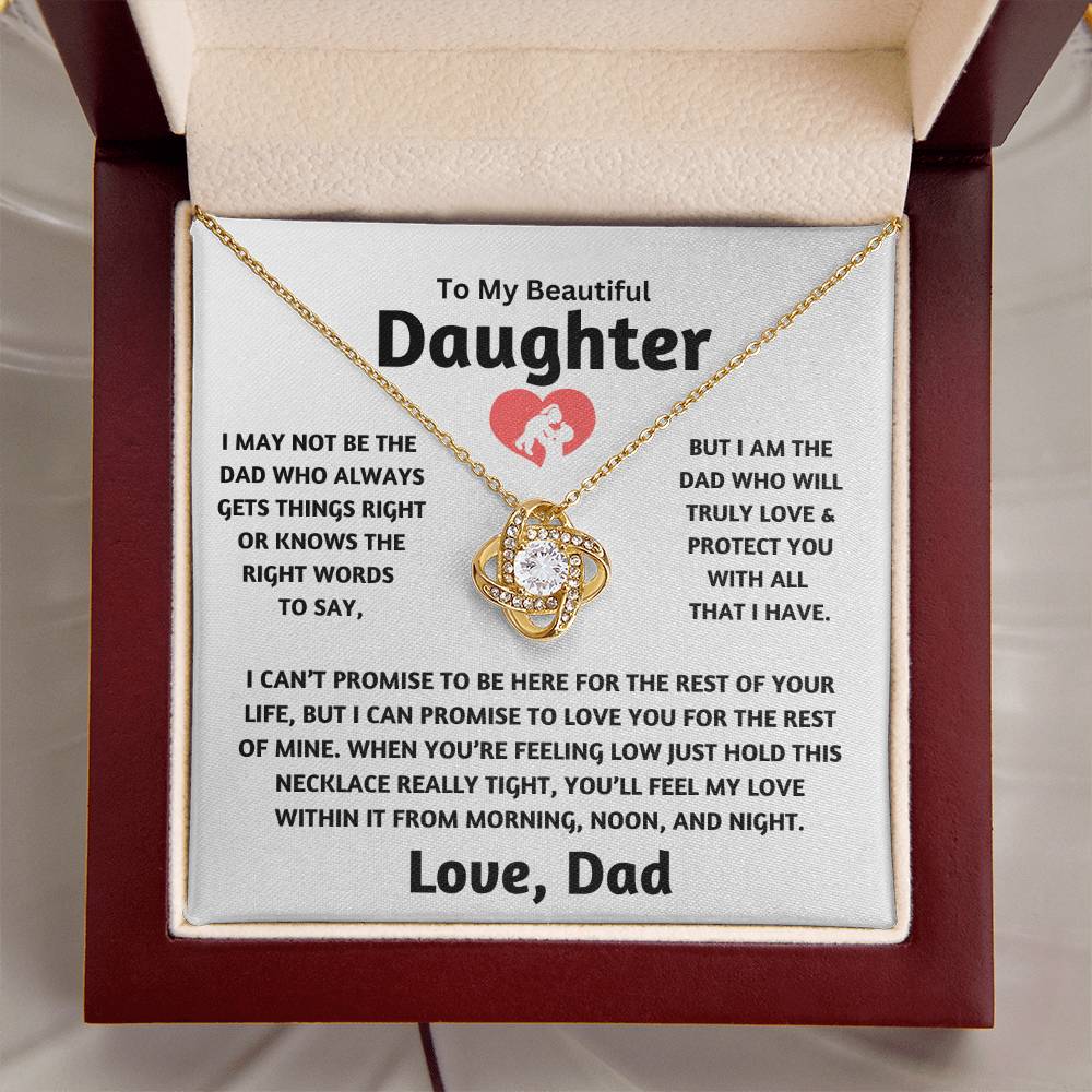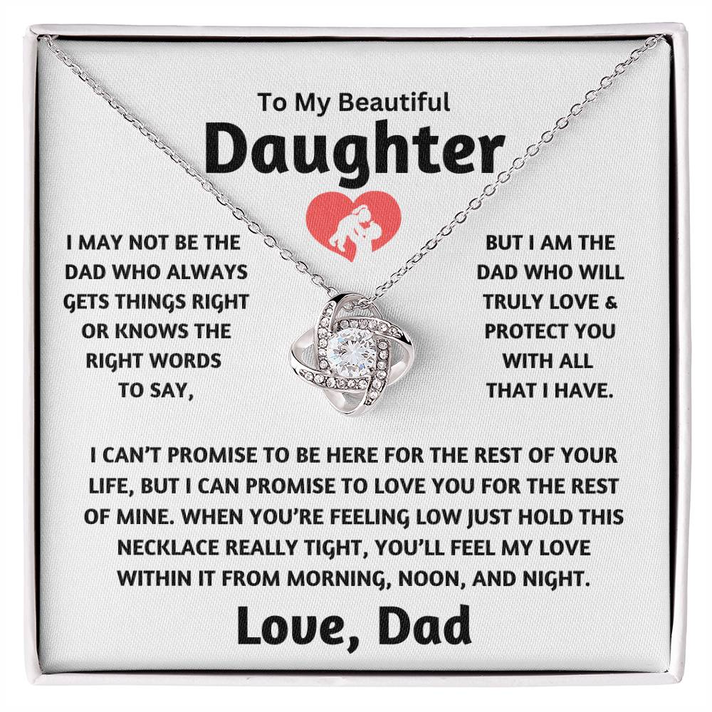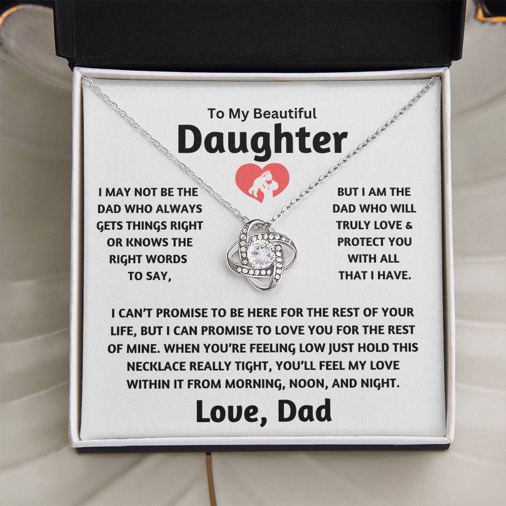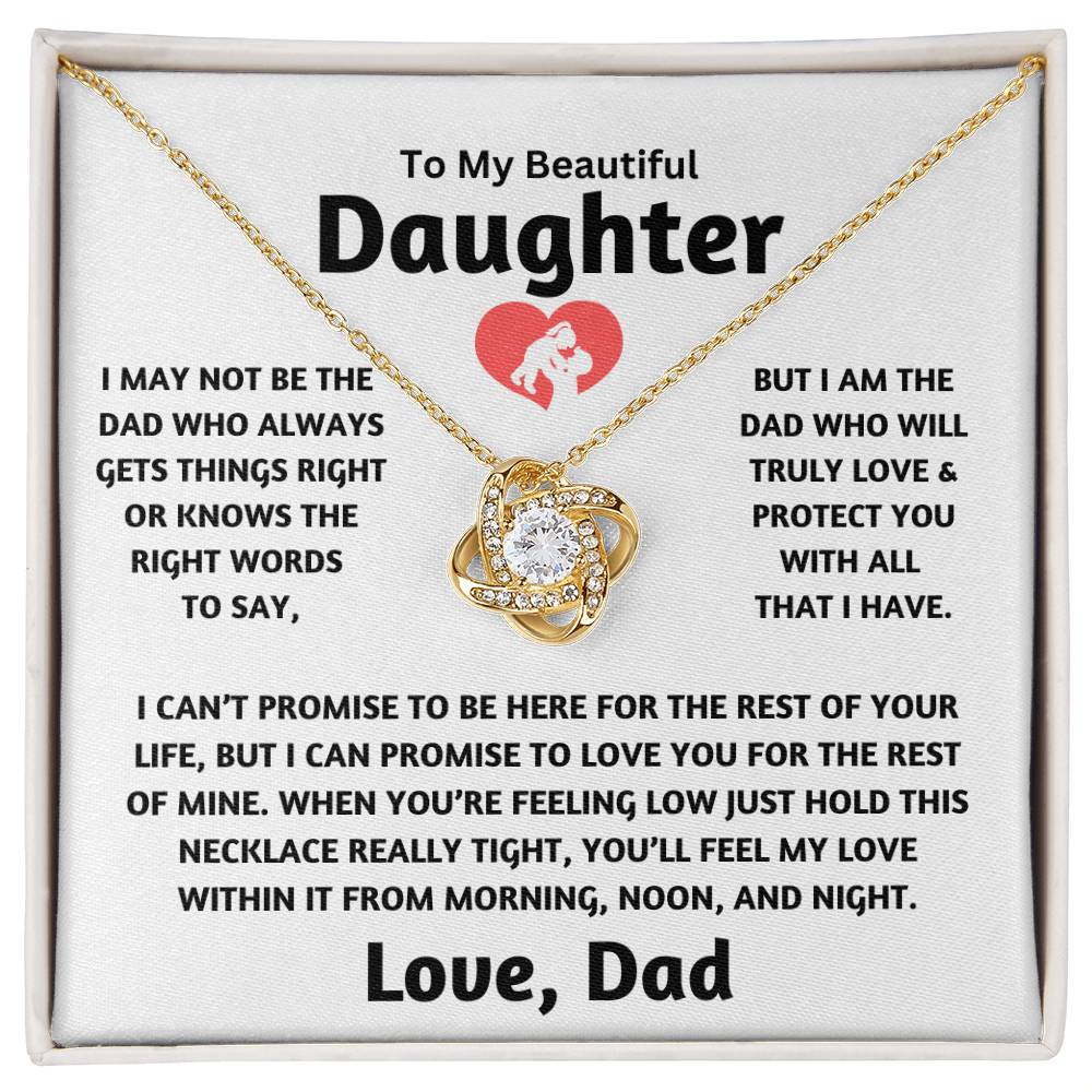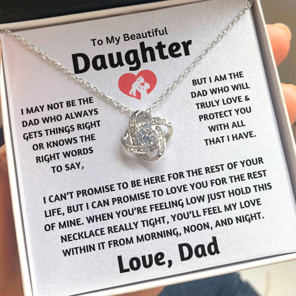 To My Beautiful Daughter, I may not be the dad who always gets things right or knows the right words to say,Ā but I am the dad who will truly love & protect you with all that I have.Ā I canāt promise to be here for the rest of your life, but I can promise to love you for the rest of mine.Ā When youāre feeling low just hold this necklace really tight, youāll feel my love within it from morning, noon, and night. Love, Dad