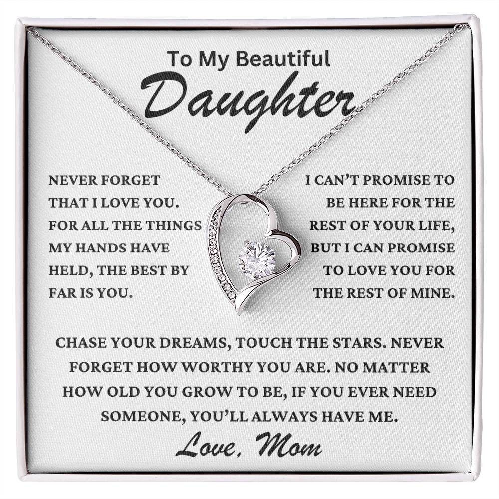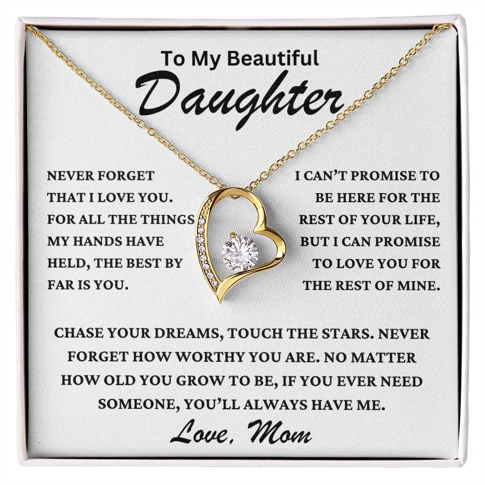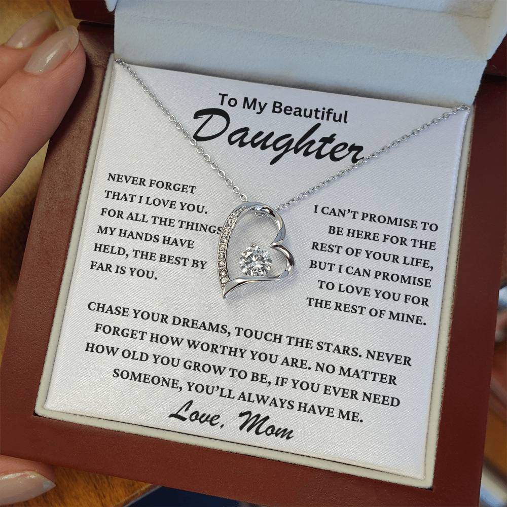 "To My Beautiful Daughter, Never forget that I love you. For all the things my hands have held, the best by far is you. I can’t promise to be here for the rest of your life, but I can promise to love you for the rest of mine. Chase your dreams, touch the stars. Never forget how worthy you are. No matter how old you grow to be, if you ever need someone, you’ll always have me. Love, Mom."