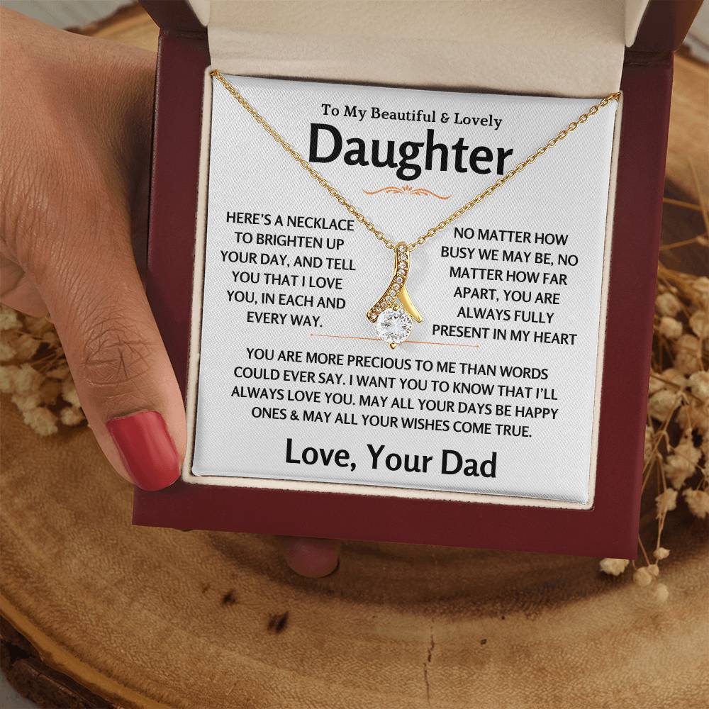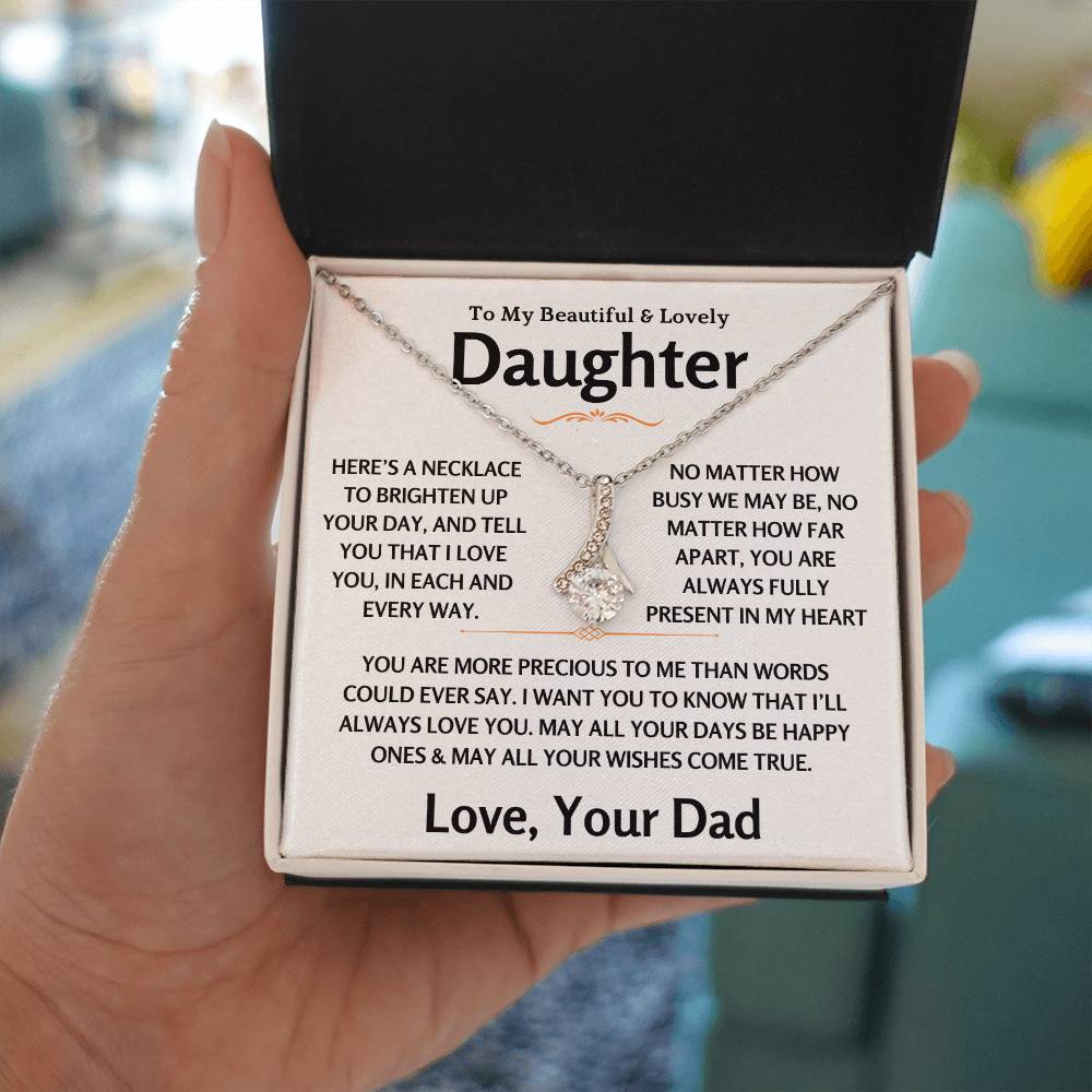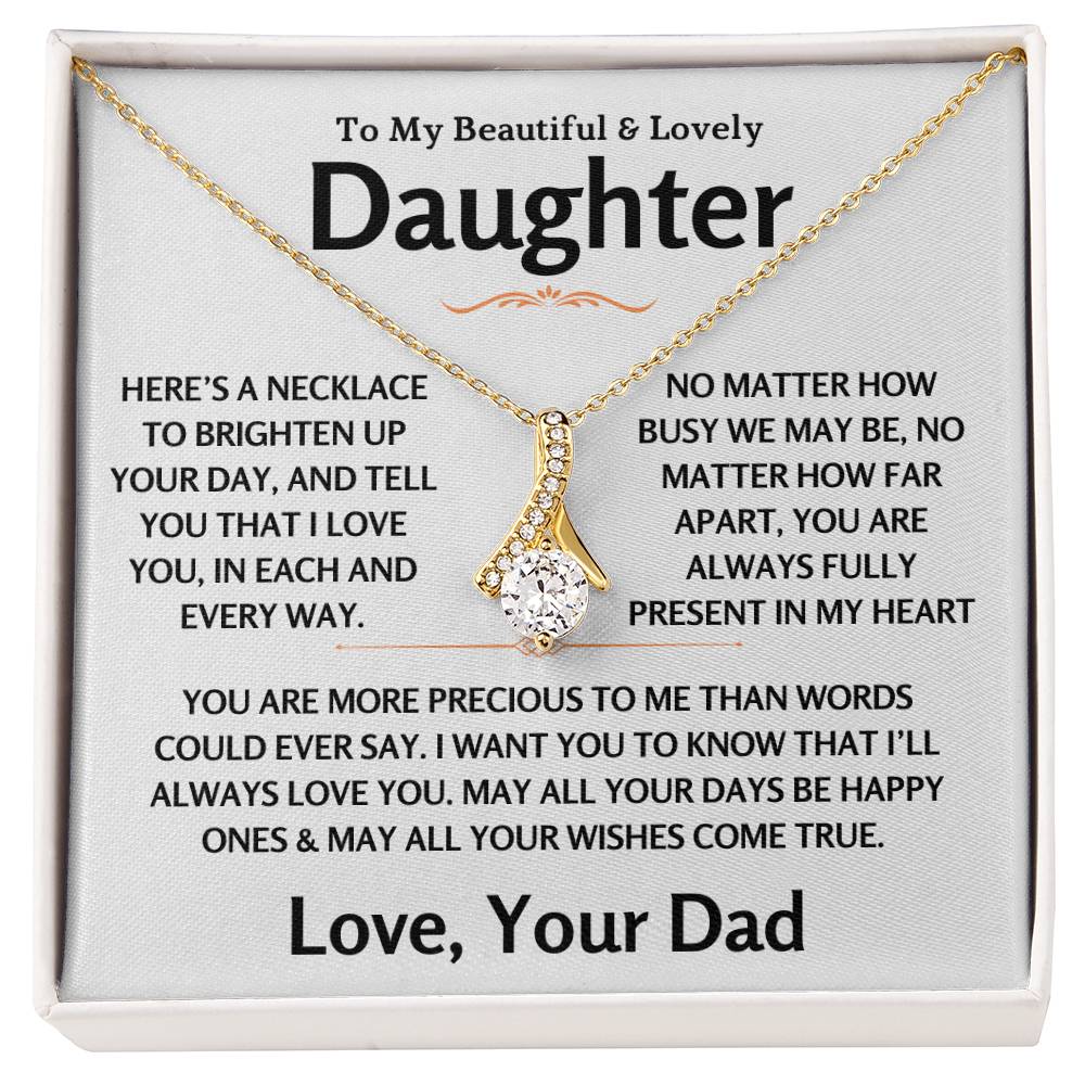 Here's a necklace to brighten up your day, and tell you that I love you in each and every way.Ā No matter how busy we may be, no matter how far apart, you are always fully present in my heart.Ā You are more precious to me than words could ever say. I want you to know that Iāll always love you. May all your days be happy ones & may all your wishes come true.Love, Your Dad (or make your preferred sign-off)
