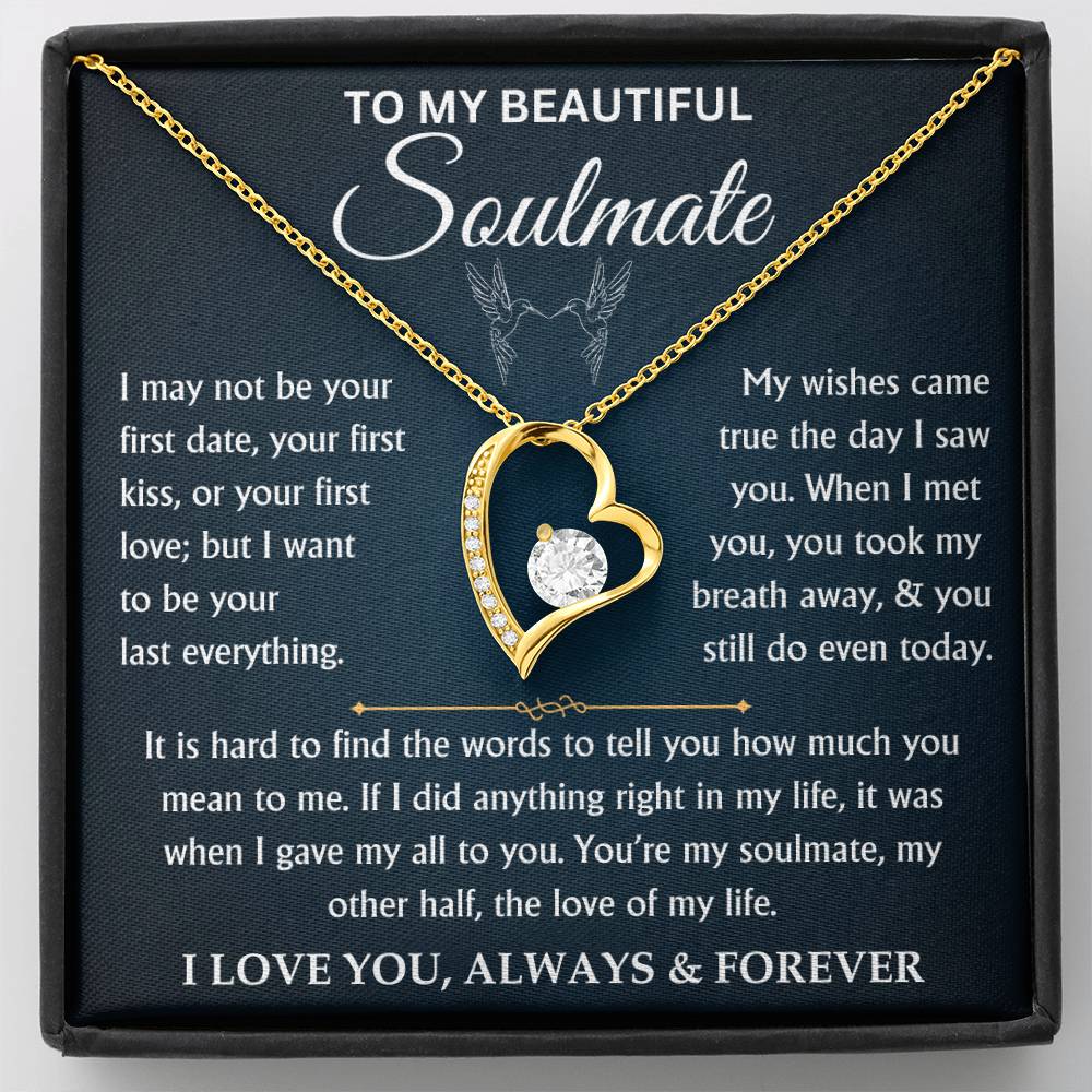 I may not be your first date, your first kiss, or your first love; but I want to be your last everything.Ā My wishes came true the day I saw you. When I met you, you took my breath away, & you still do even today.Ā It is hard to find the words to tell you how much you mean to me. If I did anything right in my life, it was when I gave my all to you. Youāre my soulmate, my other half, the love of my life.Ā I LOVE YOU, ALWAYS & FOREVER"