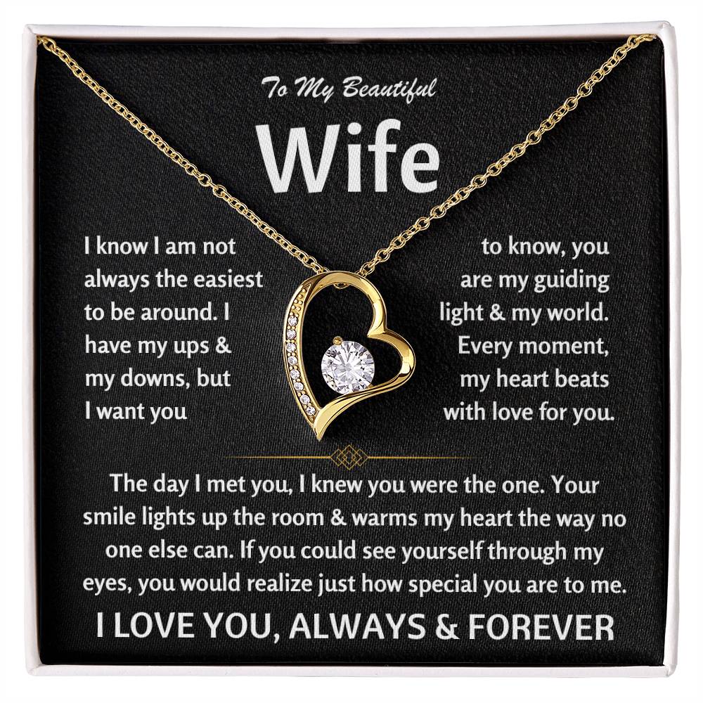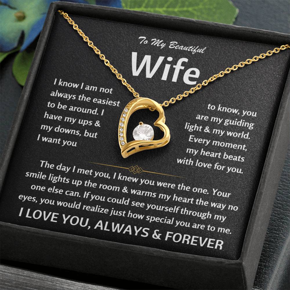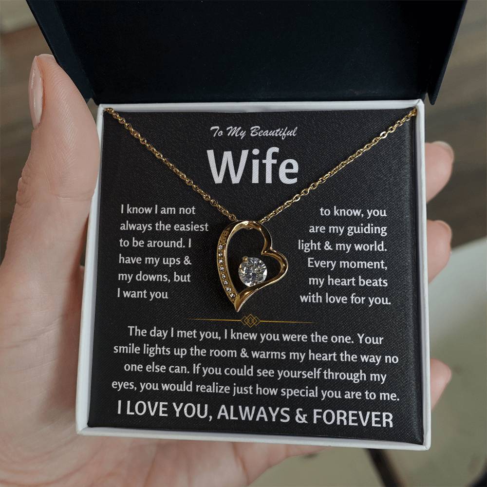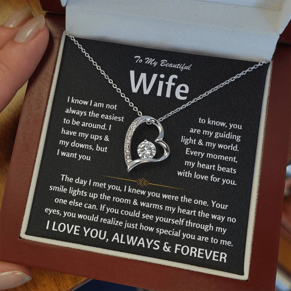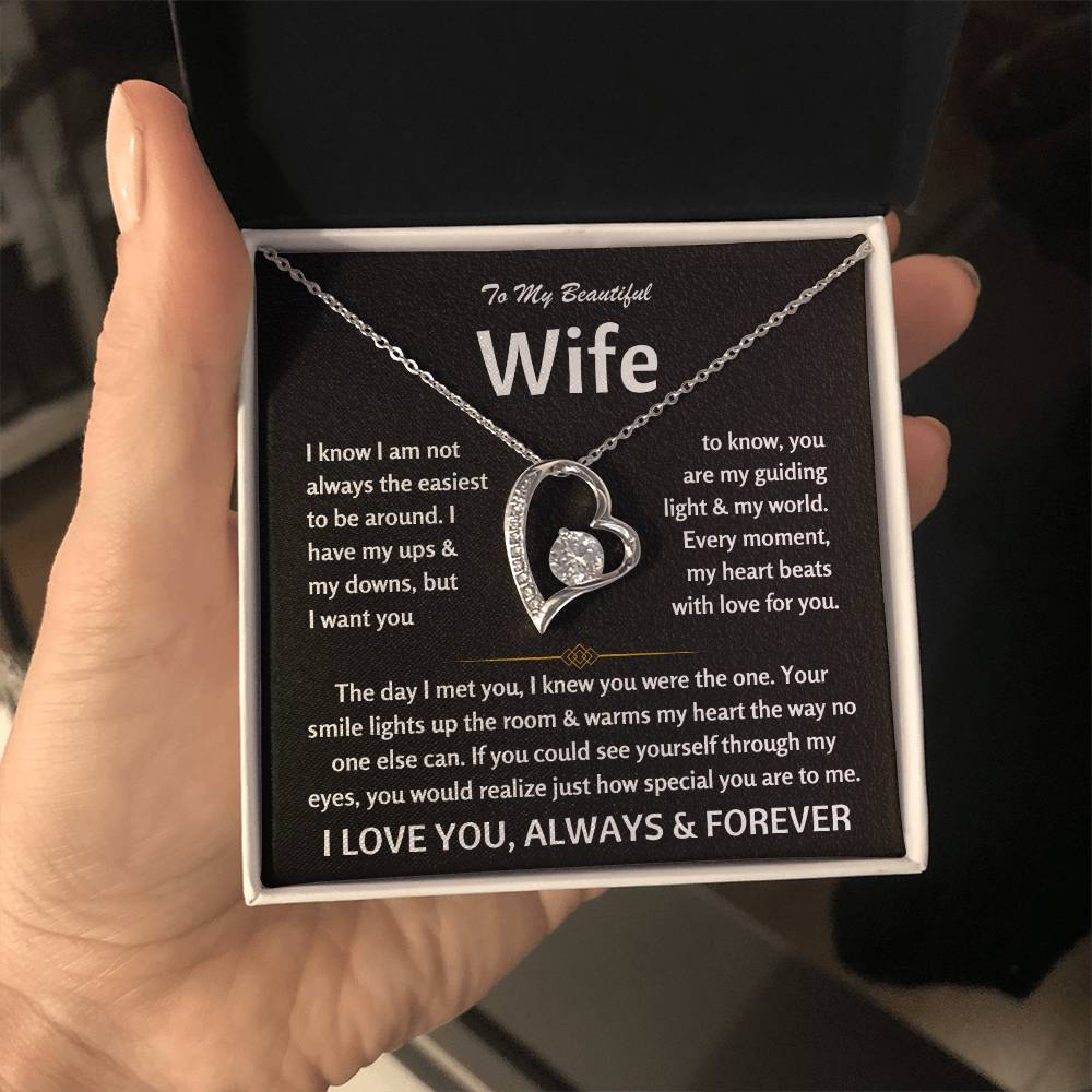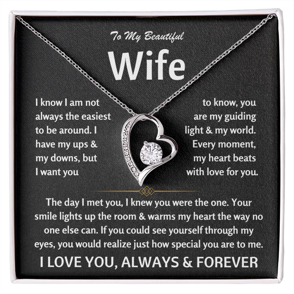 To My Beautiful Wife, I know I am not always the easiest to be around. I have my ups & my downs, but I want you to know, you are my guiding light & my world. Every moment, my heart beats with love for you. The day I met you, I knew you were the one. Your smile lights up the room & warms my heart the way no one else can. If you could see yourself through my eyes, you would realize just how special you are to me.Ā I LOVE YOU, ALWAYS & FOREVER.