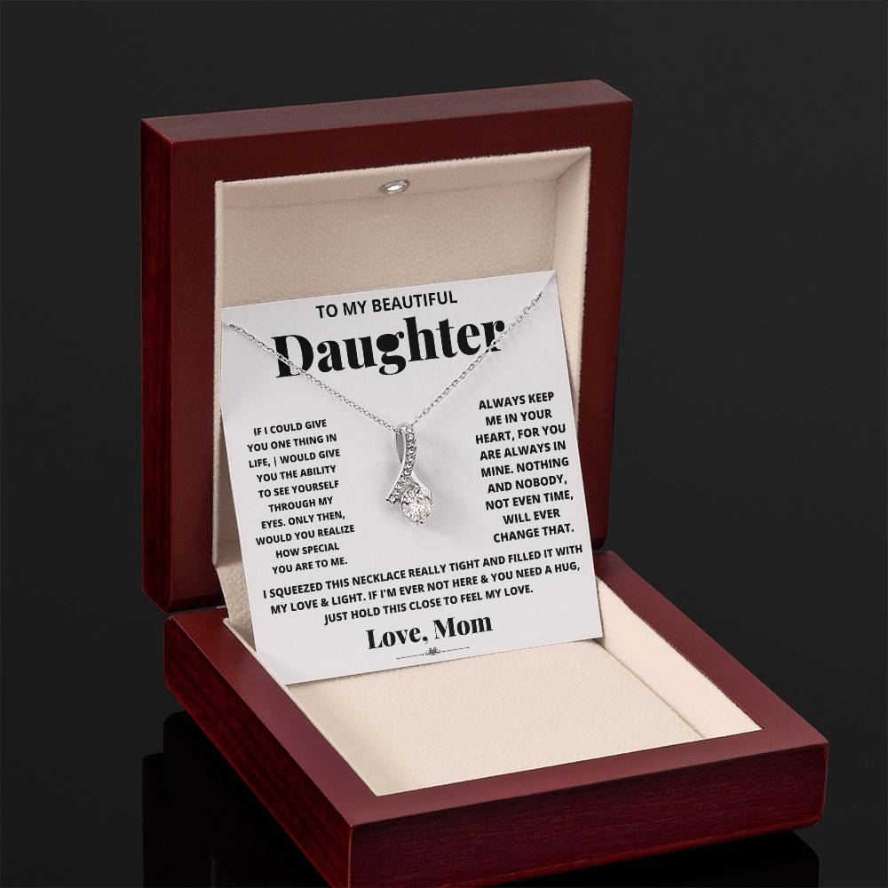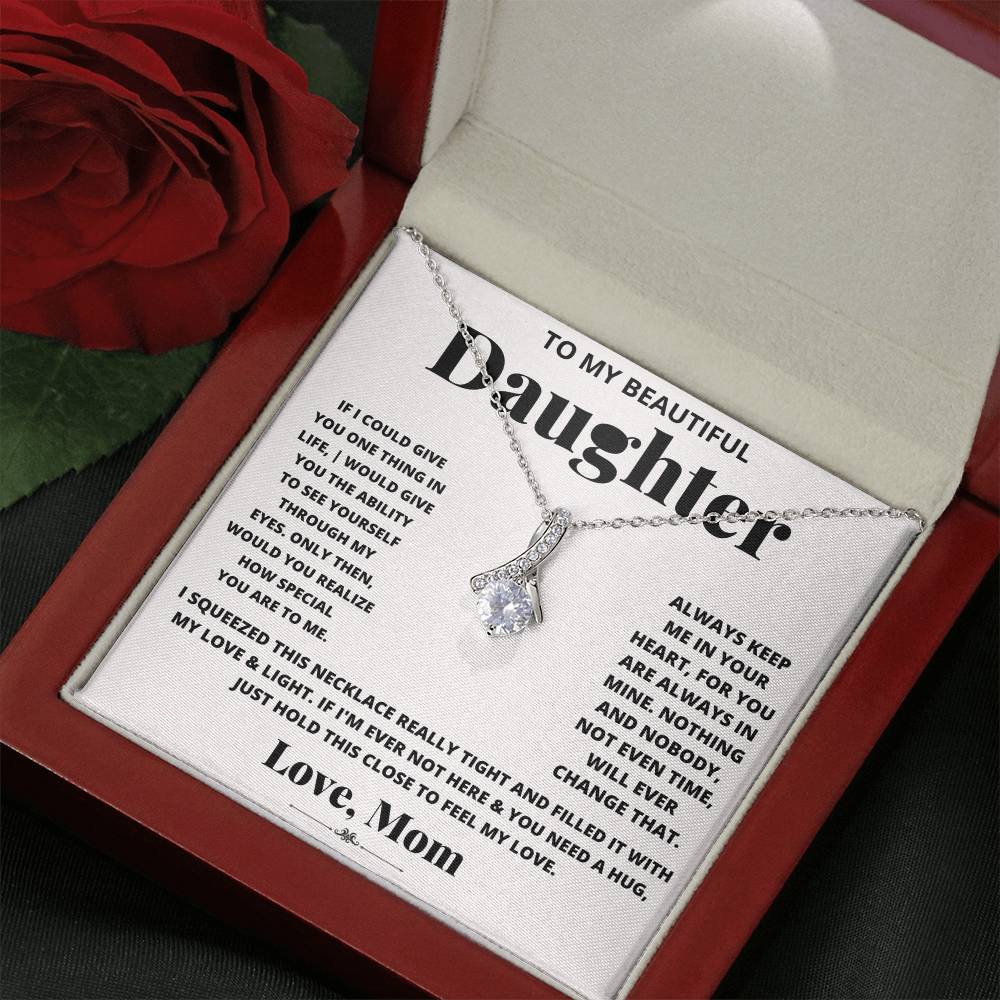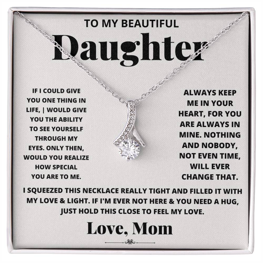 IF I COULD GIVE YOU ONE THING IN LIFE, I WOULD GIVE YOU THE ABILITY TO SEE YOURSELF THROUGH MY EYES. ONLY THEN, WOULD YOU REALIZE HOW SPECIAL YOU ARE TO ME. ALWAYS KEEP ME IN YOUR HEART, FOR YOU ARE ALWAYS IN MINE. NOTHING AND NOBODY, NOT EVEN TIME, WILL EVER CHANGE THAT. I SQUEEZED THIS NECKLACE REALLY TIGHT AND FILLED IT WITH MY LOVE & LIGHT. IF I'M EVER NOT HERE & YOU NEED A HUG, JUST HOLD THIS CLOSE TO FEEL MY LOVE.