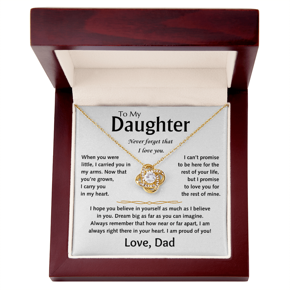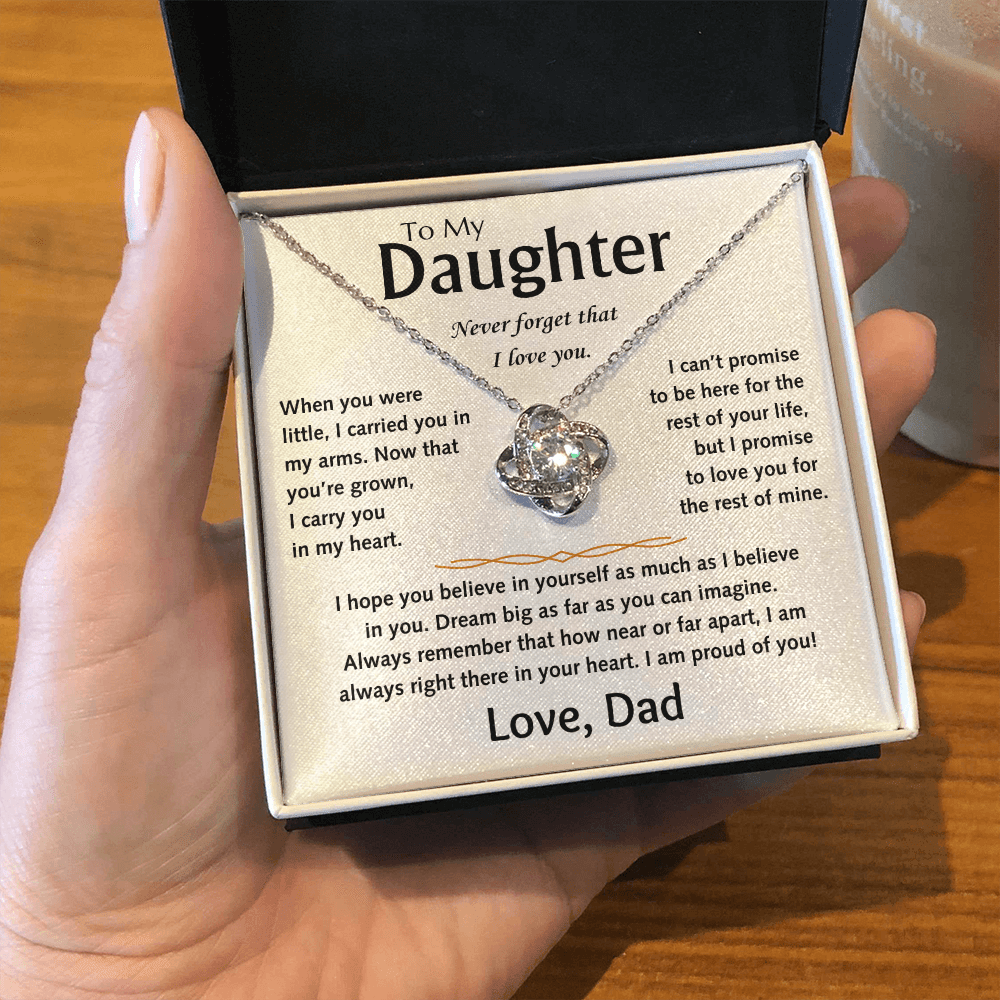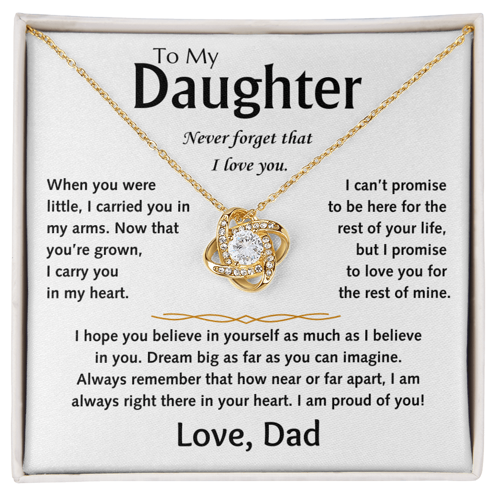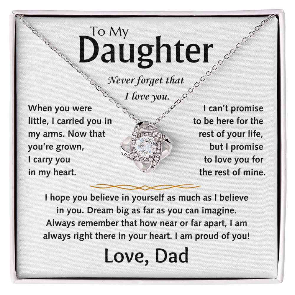 When you were little, I carried you in my arms. Now that you're grown, I carry you in my heart. I can't promise to be here for the rest of your life, but I promise to love you for the rest of mine. I hope you believe in yourself as much as I believe in you. Dream big as far as you can imagine. Always remember that how near or far apart, I am always right there in your heart. I am proud of you! Love, Dad"