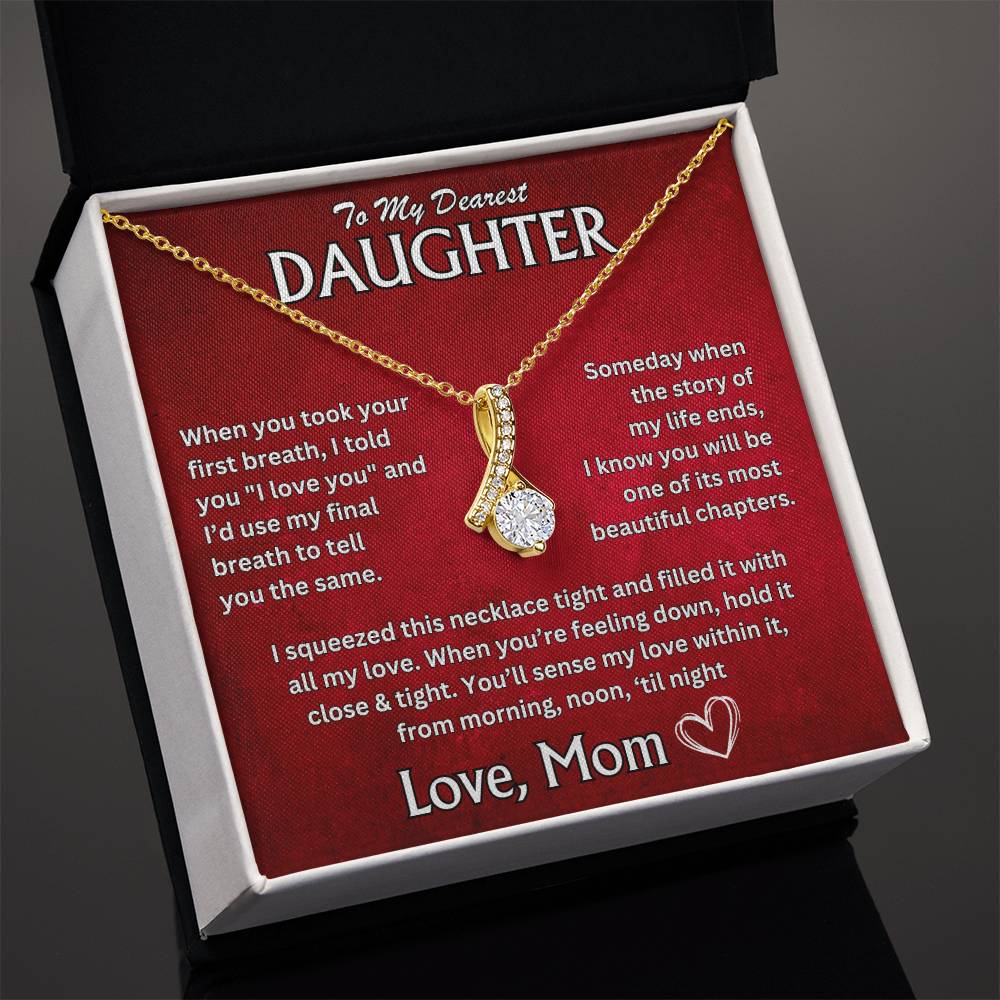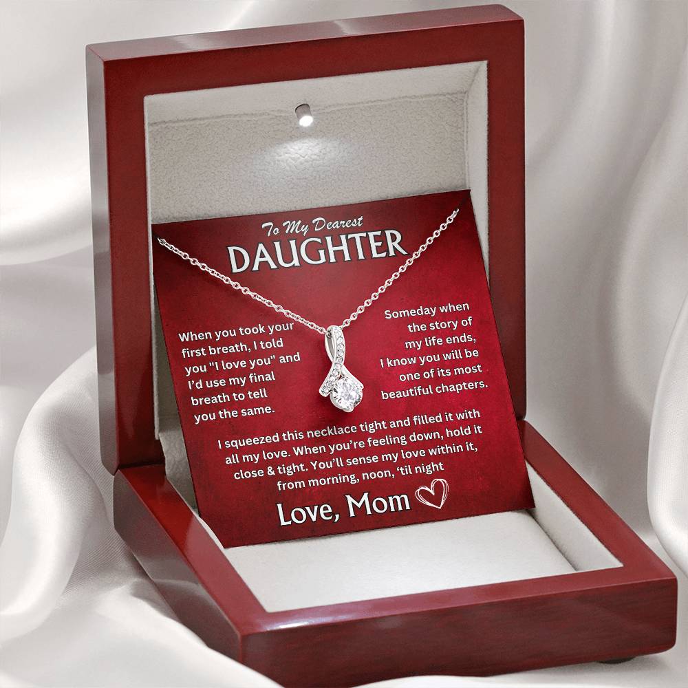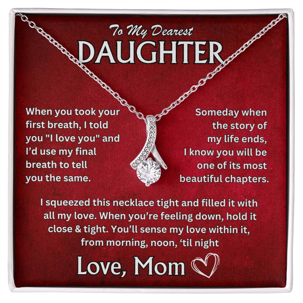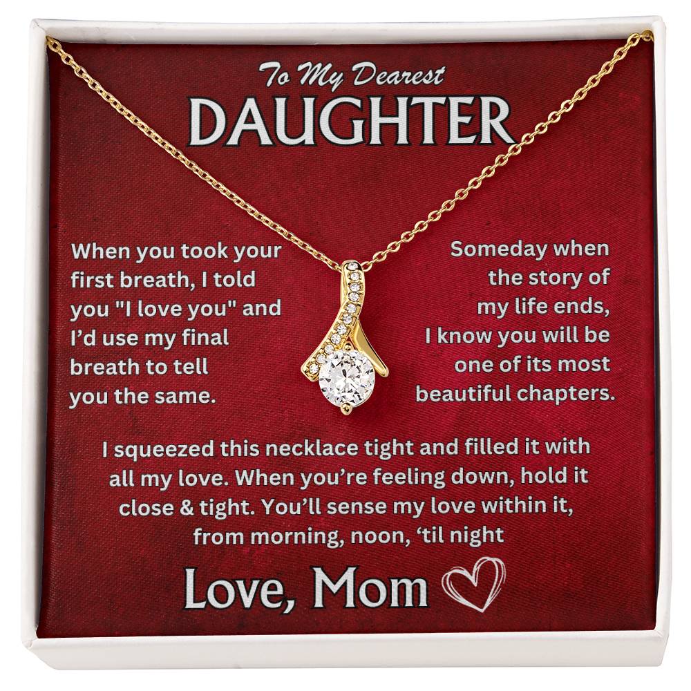"To My Dearest Daughter, When you took your first breath, I told you 'I love you,' and I'd use my final breath to tell you the same. Someday, when the story of my life ends, I know you will be one of its most beautiful chapters. I squeezed this necklace tight and filled it with all my love. When you're feeling down, hold it close and tight. Youāll sense my love within it, from morning, noon, 'til night. Love, Mom"