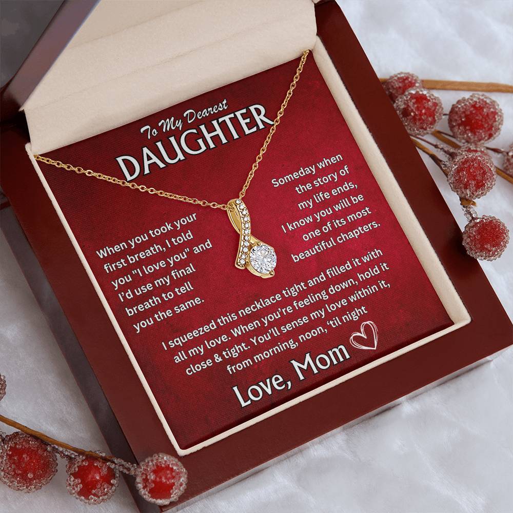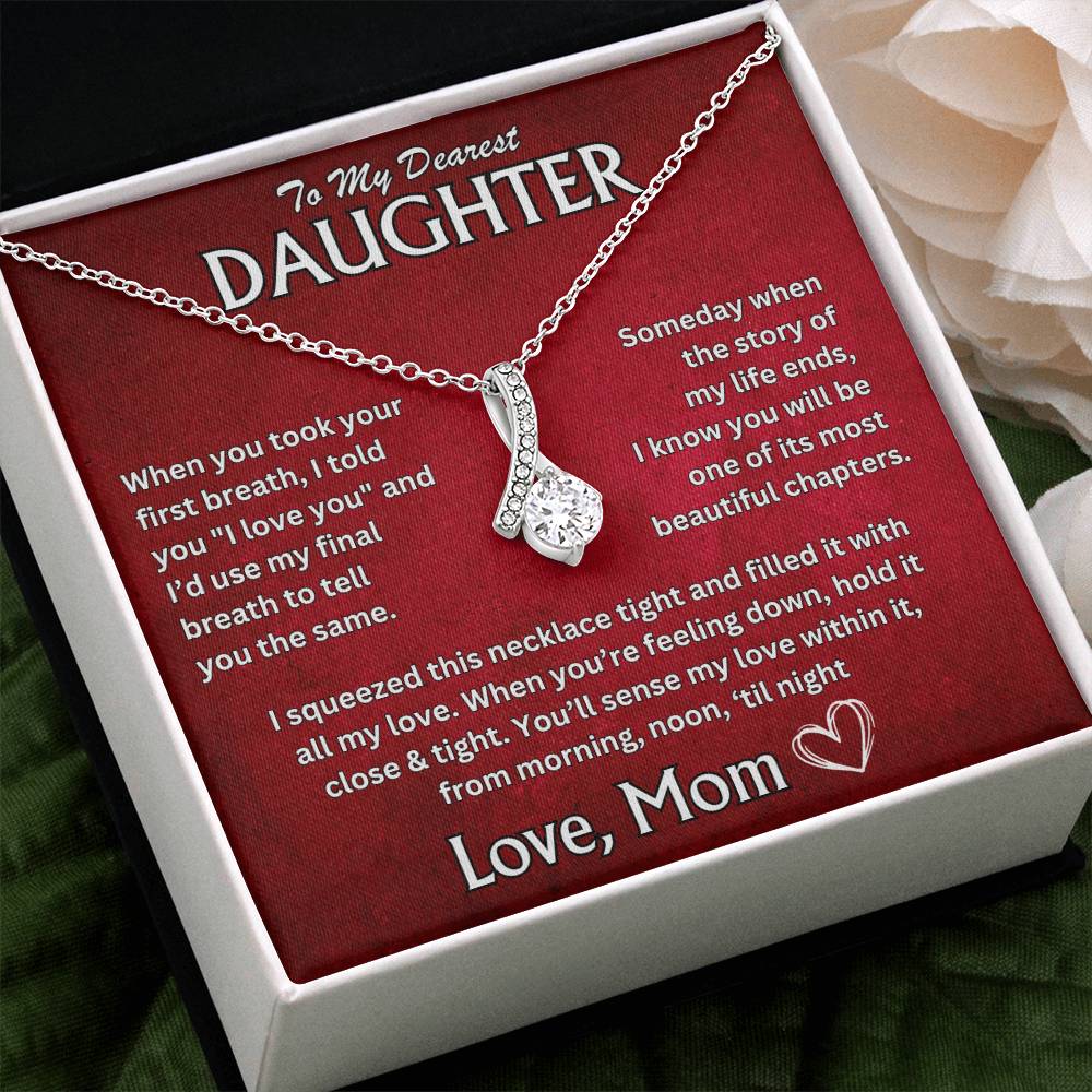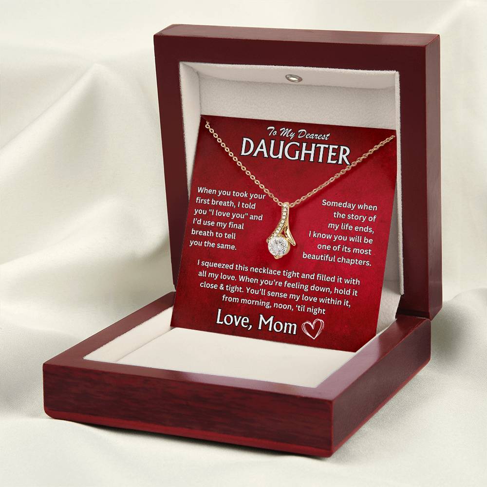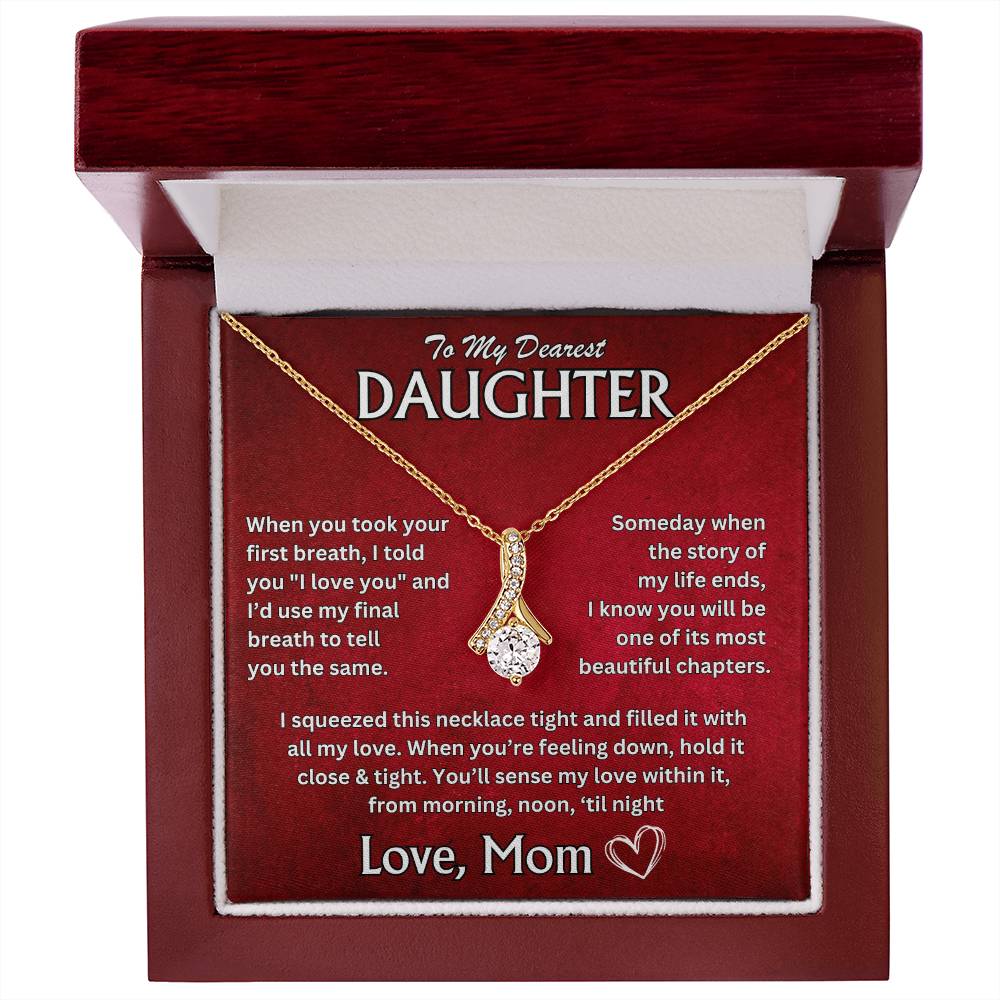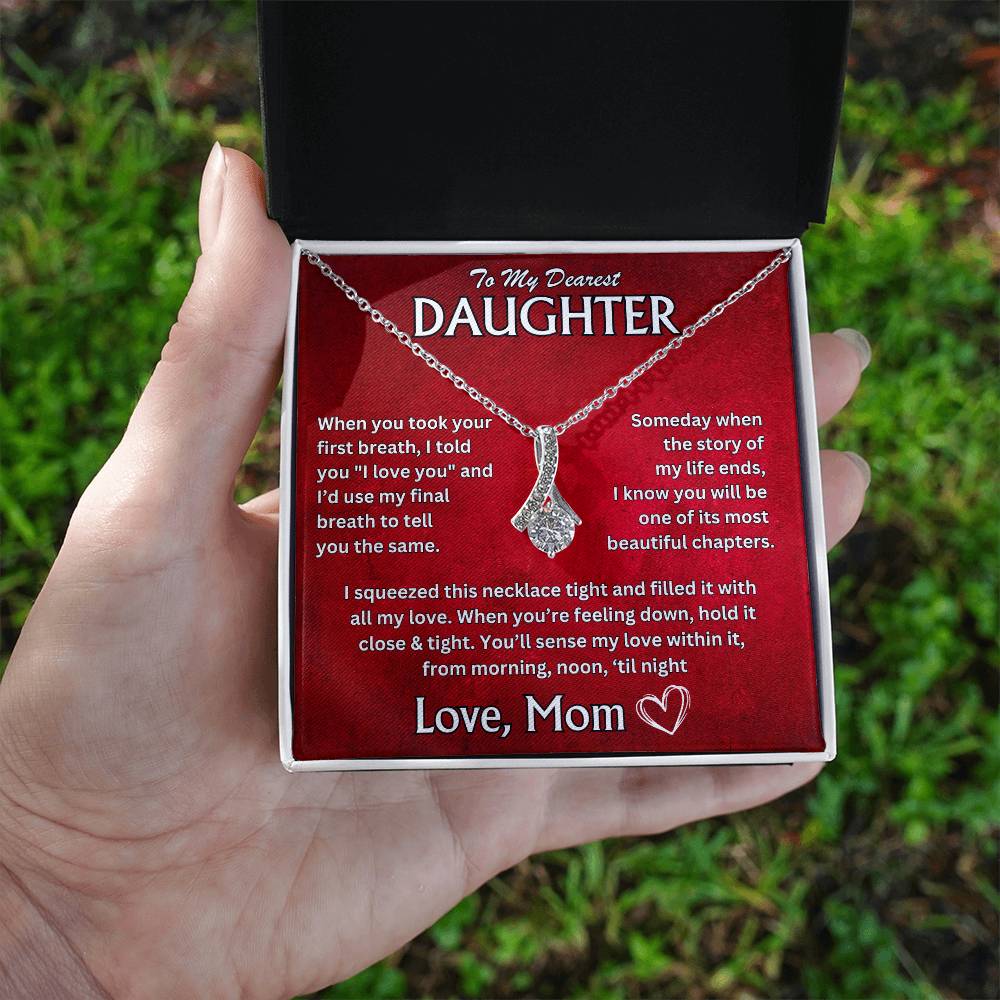 "To My Dearest Daughter, When you took your first breath, I told you 'I love you,' and I'd use my final breath to tell you the same. Someday, when the story of my life ends, I know you will be one of its most beautiful chapters. I squeezed this necklace tight and filled it with all my love. When you're feeling down, hold it close and tight. Youāll sense my love within it, from morning, noon, 'til night. Love, Mom"