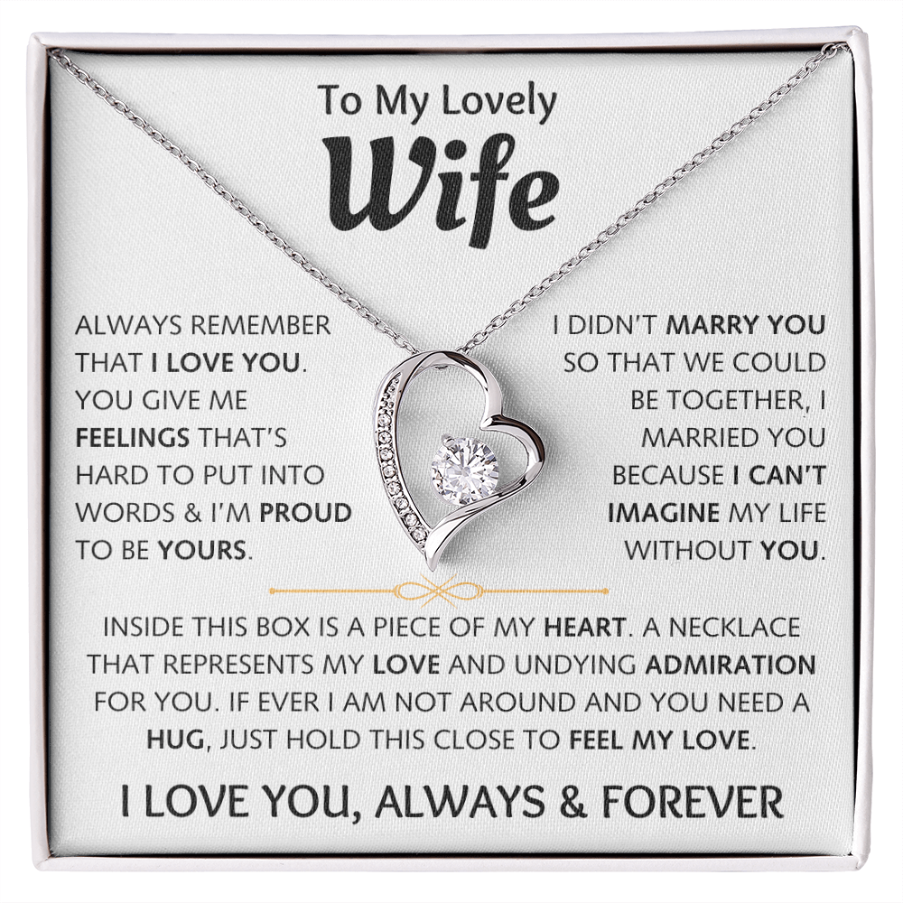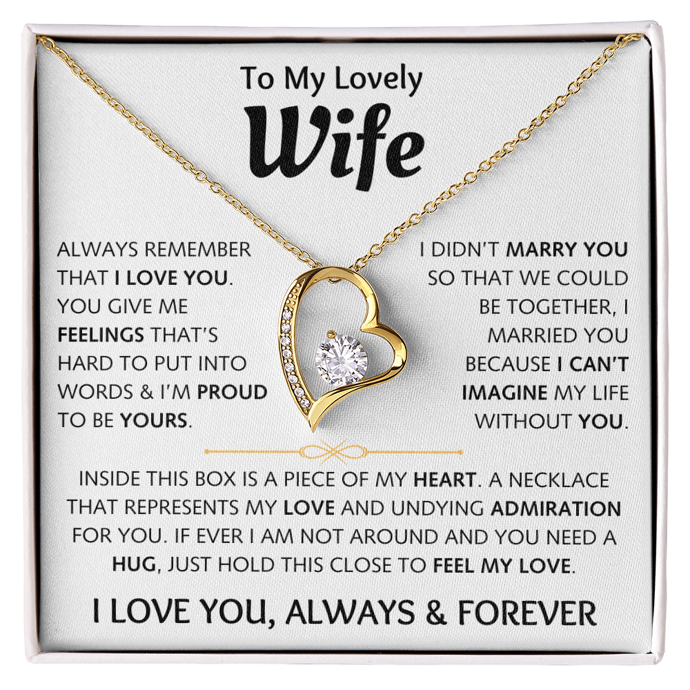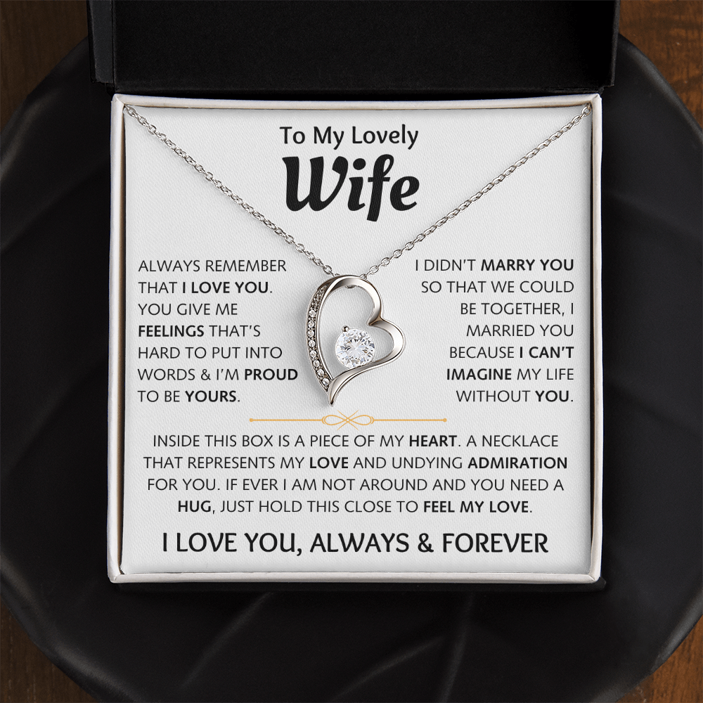 Always remember that I love you. You give me feelings that's hard to put into words & I'm proud to be yours. I didn't marry you so that we could be together. I married you because I can't imagine my life without you. Inside this box is a piece of my heart. A necklace that represents my love and undying admiration for you. If ever I am not around and you need a hug, just hold this close to feel my love.