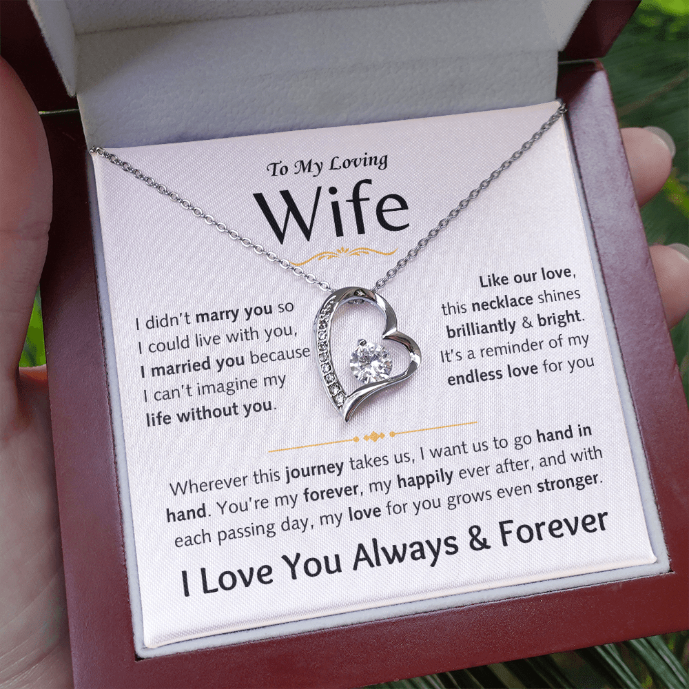 I didnāt marry you so I could live with you, I married you because I canāt imagine my life without you. Like our love, this necklace shines brilliantly & bright. Itās a reminder of my endless love for you. Wherever this journey takes us, I want us to goĀ hand in hand. Youāre my forever, my happily ever after, and with each passing day, my love for you grows even stronger.