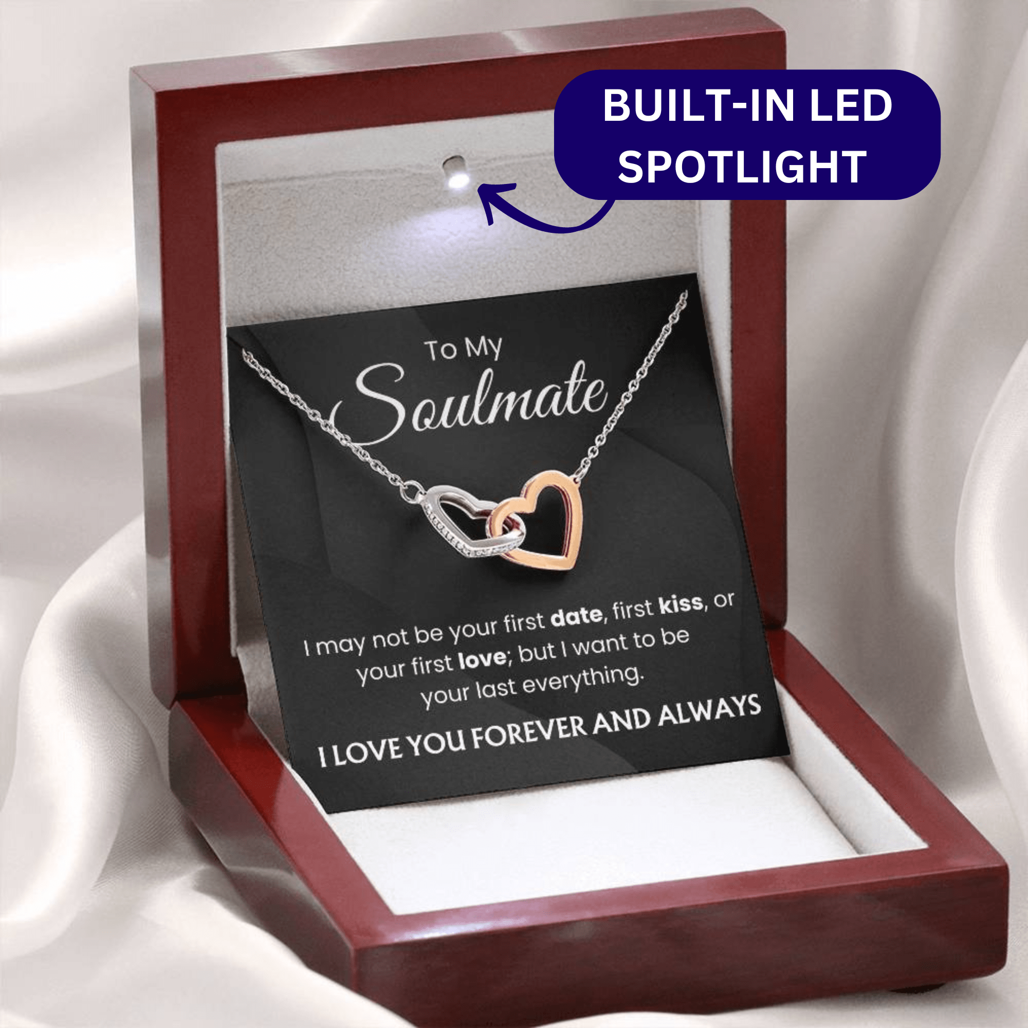 Two-toned box or Mahogany style box with built-in led spotlight that lights upon the necklace and the message card, making it more special.