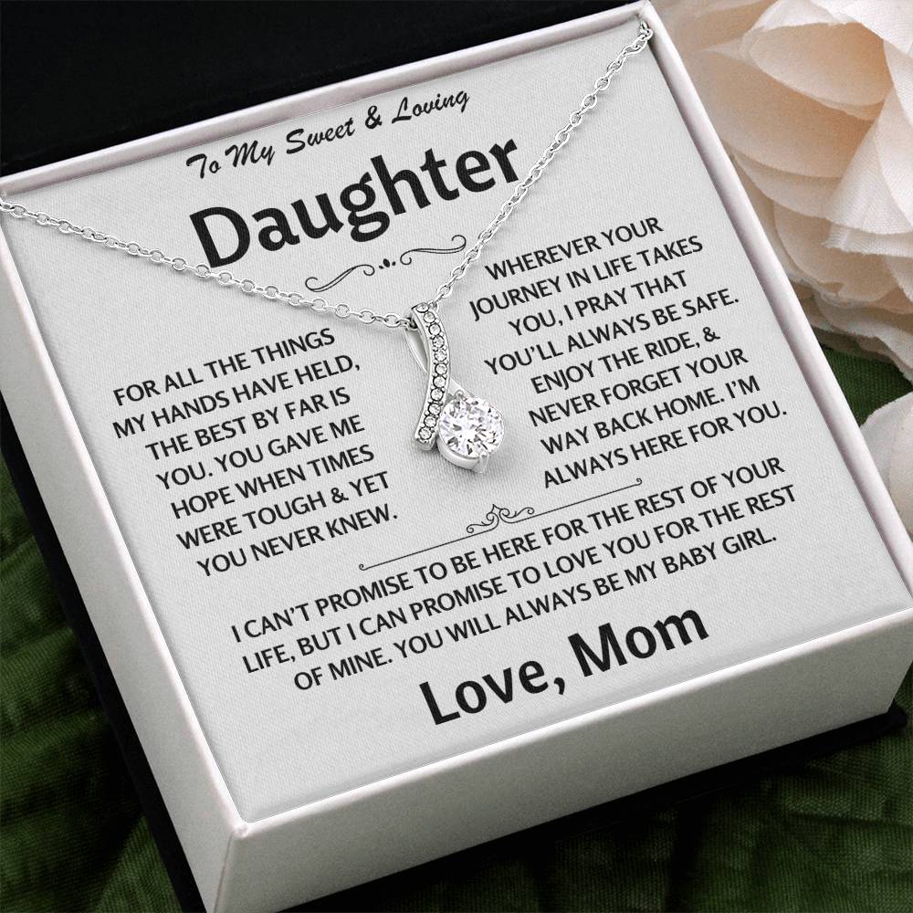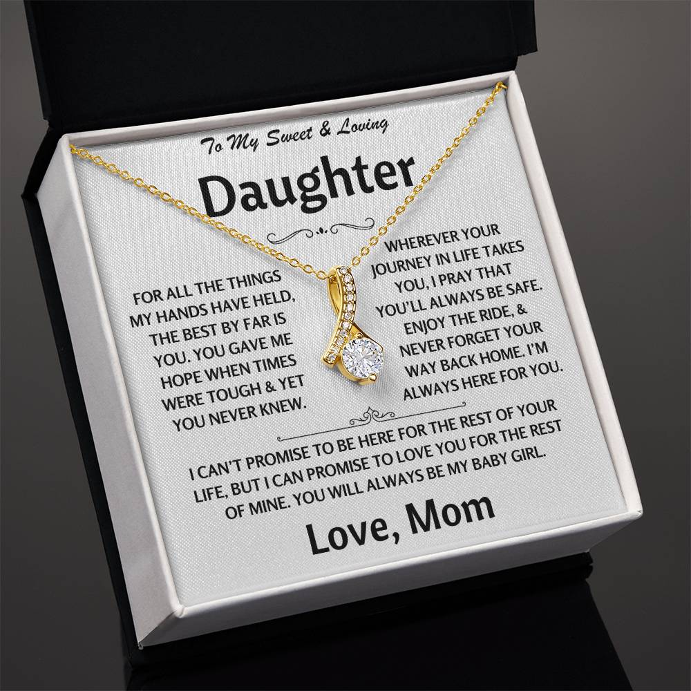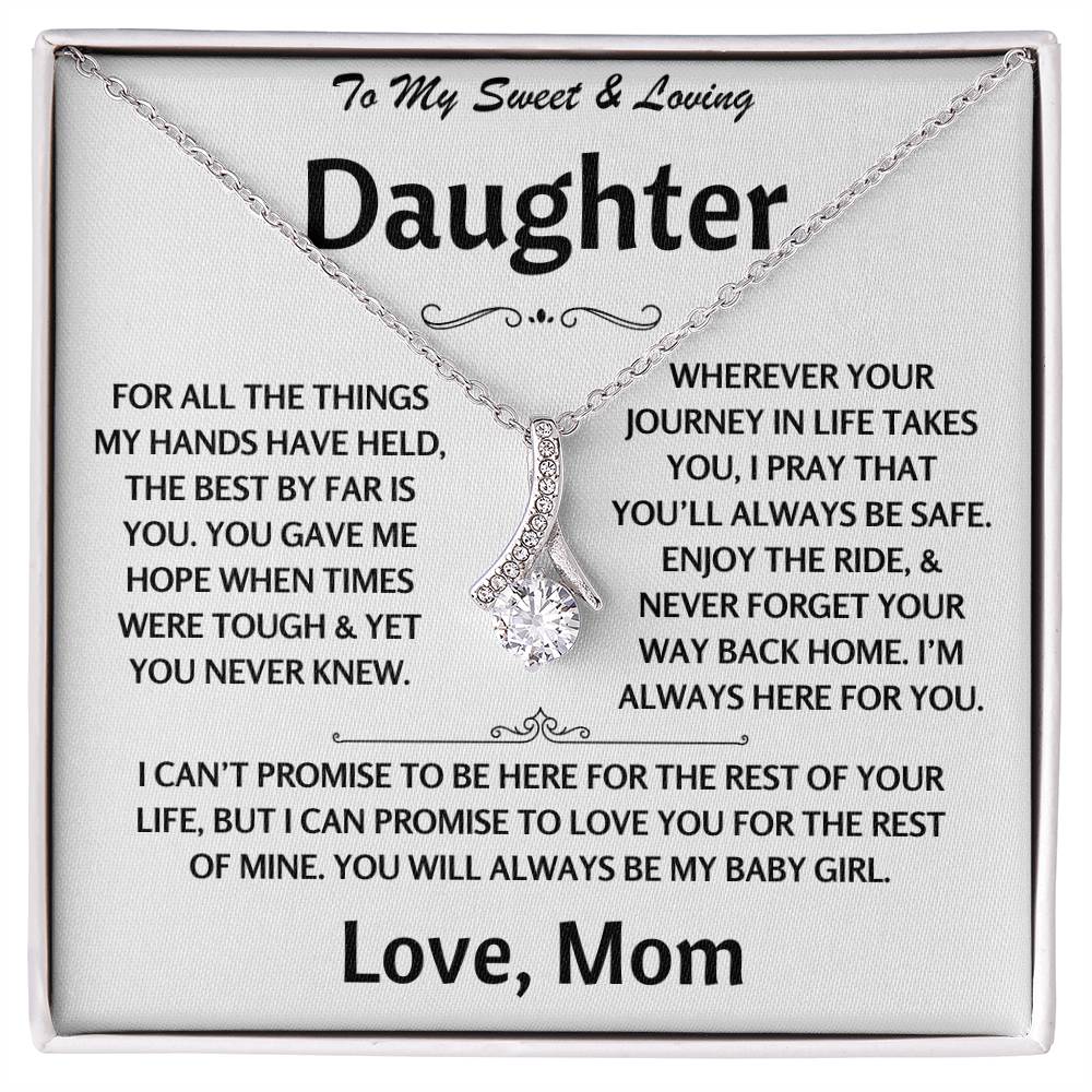 For all the things my hands have held, the best by far is you. You gave me hope when times were tough & yet you never knew.Ā Wherever your journey in life takes you, I pray that you'll always be safe, enjoy the ride, & never forget your way back home. I'm always here for you.Ā I can't promise to be here for the rest of your life, but I can promise to love you for the rest of mine. You will always be my baby girl." Love, Mom