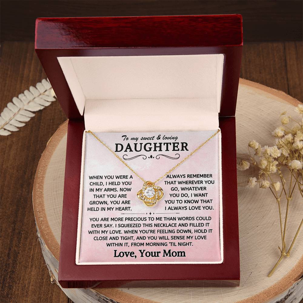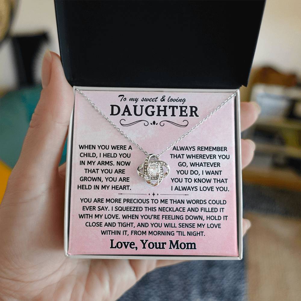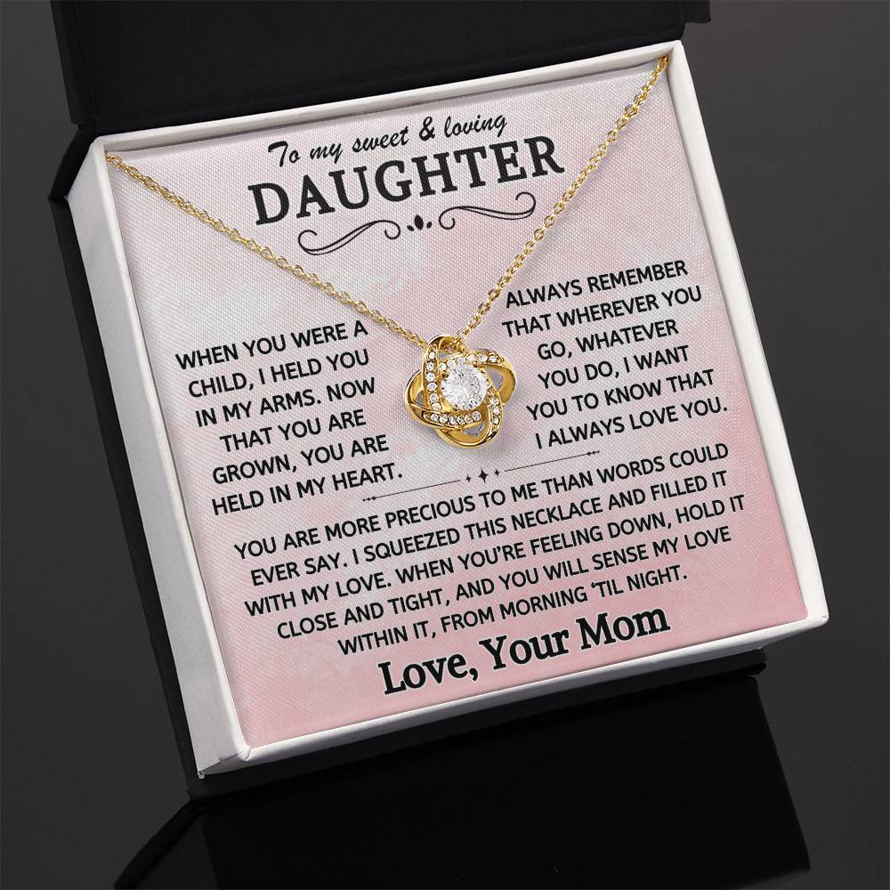 "To My Sweet and Loving Daughter, When you were a child, I held you in my arms. Nowthat you are grown, you are held in my heart. Always remember that wherever you go, whatever you do, I want you to know that I always love you. You are more precious to me than words could ever say. I squeezed this necklace and filled it with my love. When you're feeling down, hold it close and tight, and you will sense my love within it, from morning 'til night. Love, Your Mom"