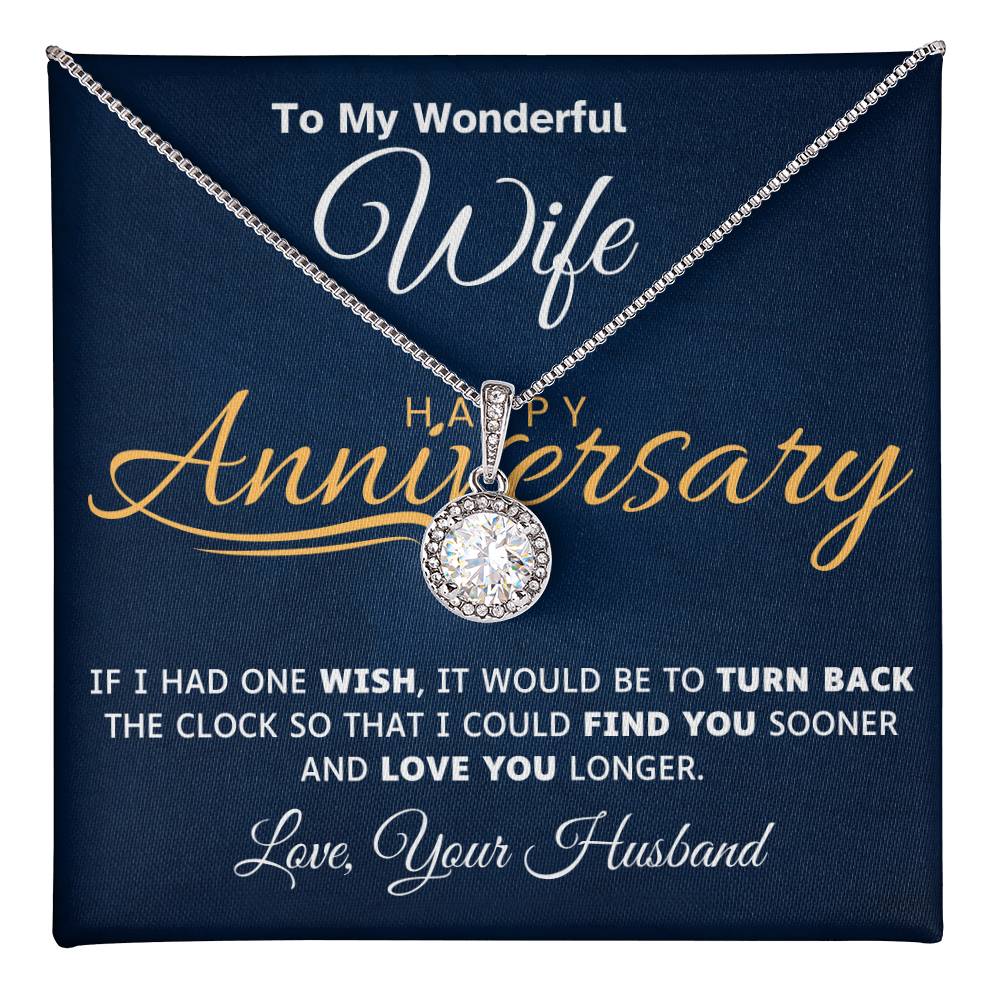 "TO MY WONDERFUL WIFE - Happy Anniversary! If I had one wish, It would be to turn back the clock so that I could find you sooner and love you longer. - Love, Your Husband"